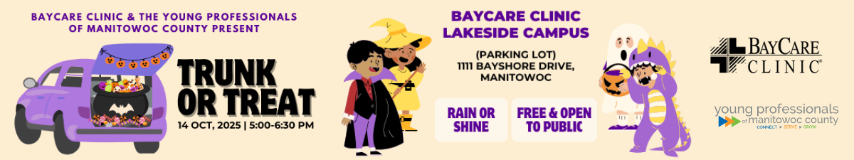The Young Professionals of Manitowoc County, in partnership with BayCare Clinic, invite local businesses to take part in our upcoming Trunk or Treat event. This is a great opportunity to showcase your business while helping create a fun and safe evening for local families.